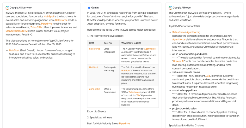 Why this matters: AI engines don’t all say the same thing. For the same query, ChatGPT might lead with product recommendations while Gemini focuses on educational context.