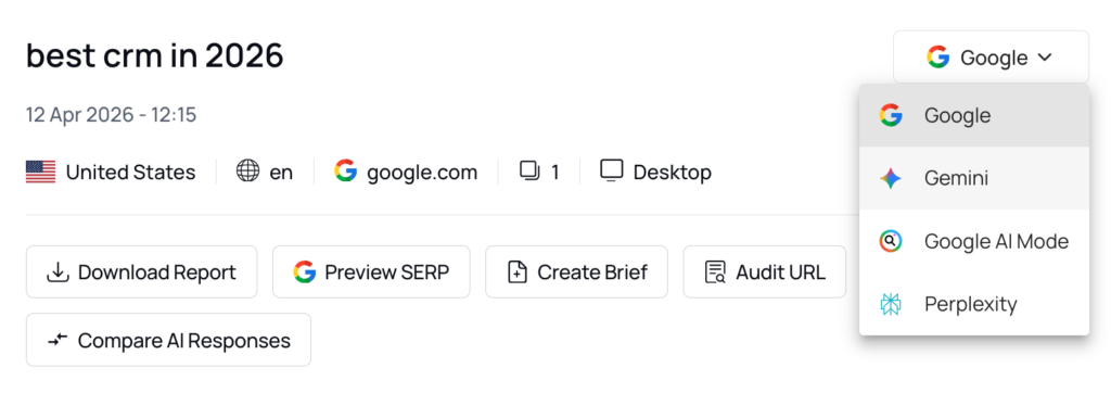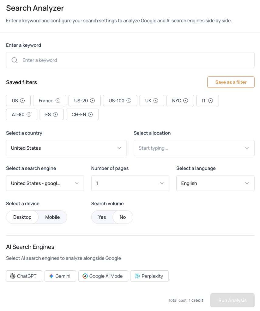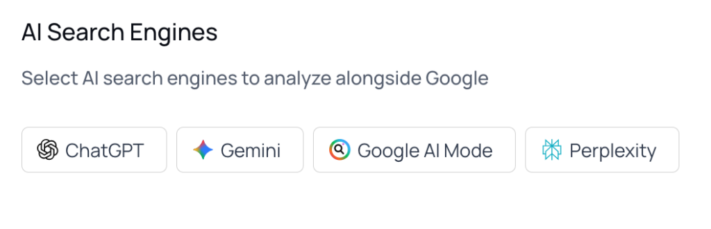 Credit cost: Each AI engine you include costs 1 additional credit on top of the Google SERP analysis credit. If you analyze Google + ChatGPT + Gemini + Google AI Mode + Perplexity, that’s 5 credits total.