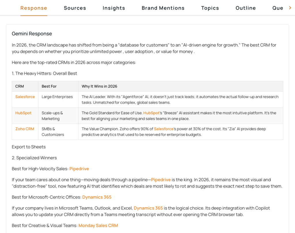 - AI Response: Read every engine’s summary side by side. One engine might lead with product recommendations while another focuses on educational context. Spotting these differences tells you what kind of content each engine favors.