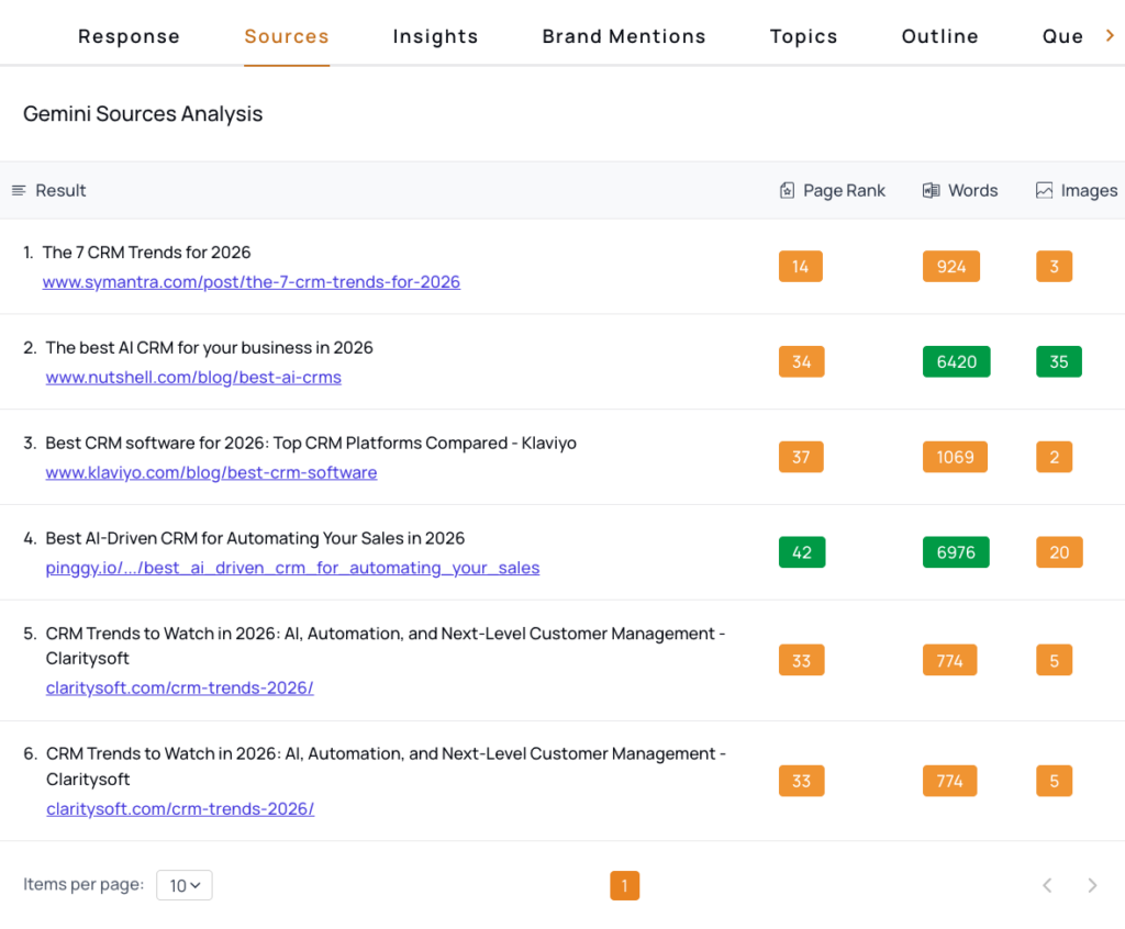 - Sources: All cited sources with on-page data (word count, image count, and more). Click any source for detailed analysis.