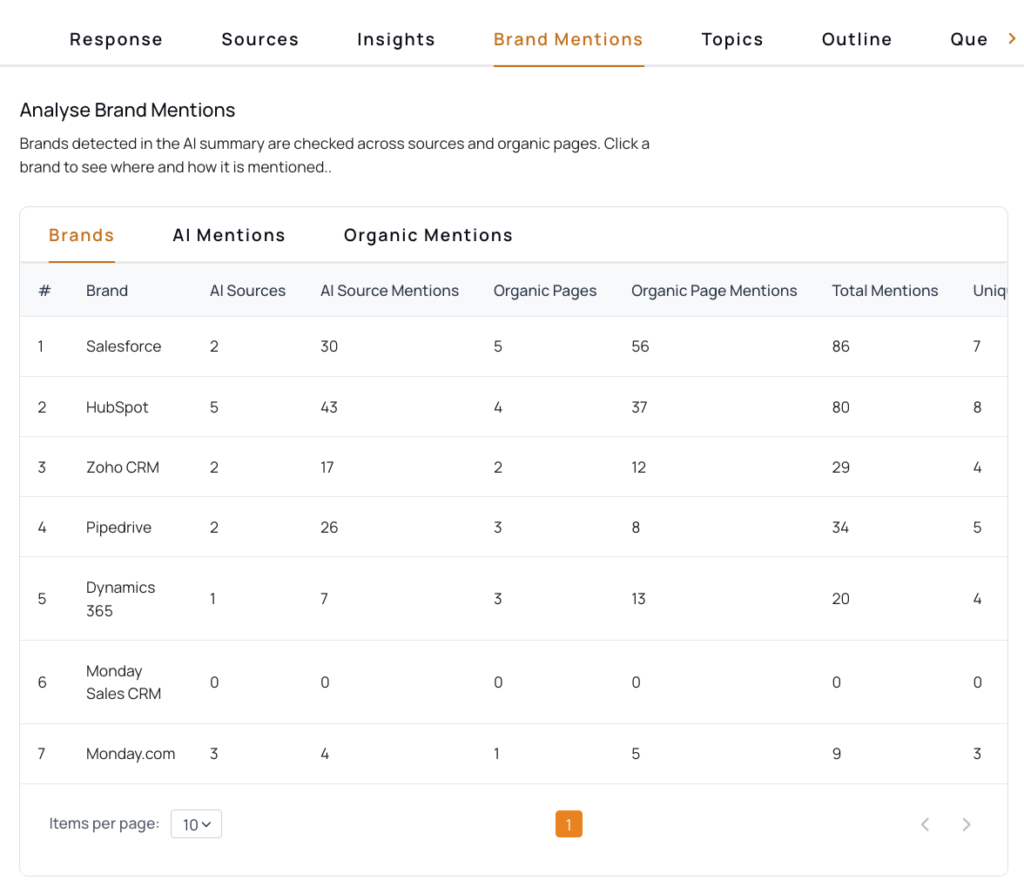 The Brand Mentions tab shows you every brand detected in an AI engine’s response, then checks how often each brand appears across the engine’s cited sources and across Google’s organic results.