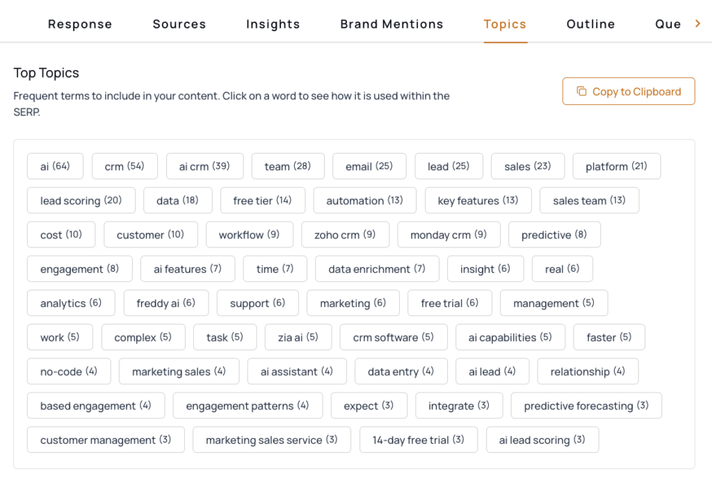 The Topics tab runs n-gram analysis across all source pages cited by AI engines. You’ll see the most frequent terms and phrases, helping you understand the vocabulary AI engines associate with your keyword.