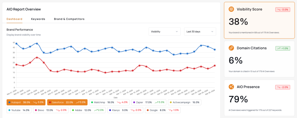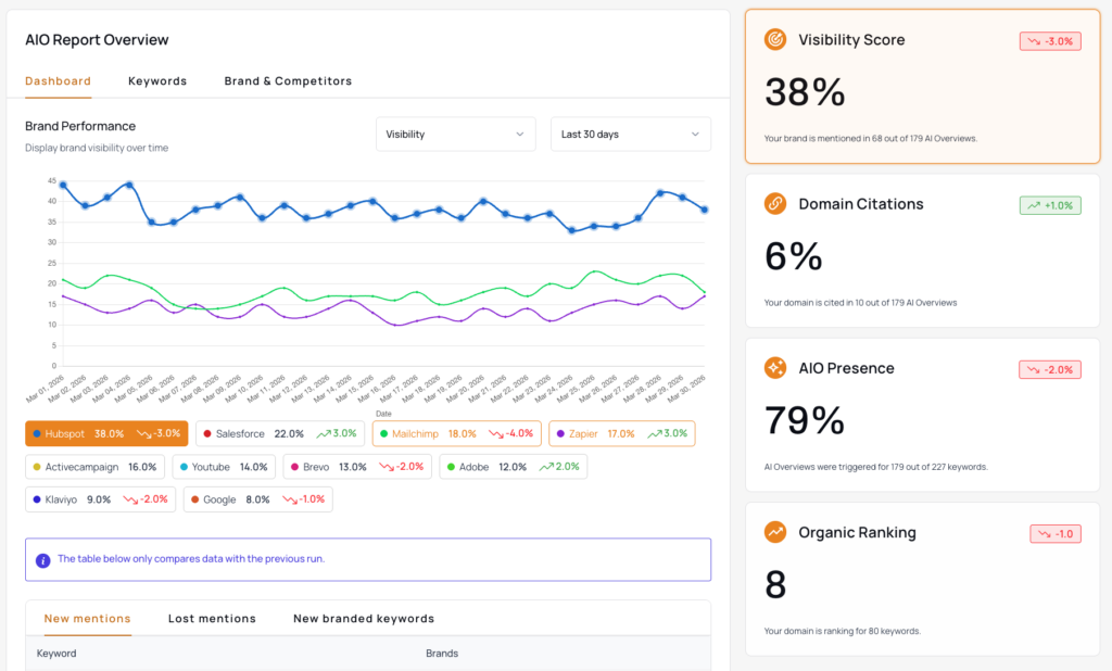 Unlike traditional rank trackers that report your position in the organic blue-link results, these tools identify whether your domain is cited as a source in an AI Overview, whether your brand name is mentioned in the summary text, and how your visibility compares to competitors across a set of tracked keywords.