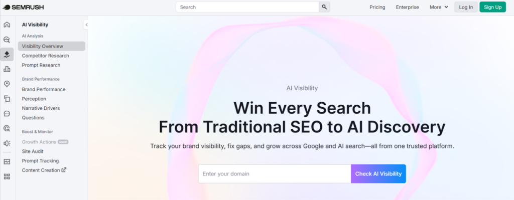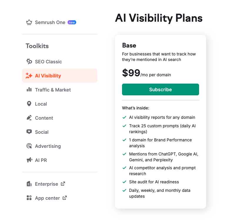 Semrush offers AI visibility tracking as a dedicated add-on through its AI Visibility toolkit, priced at $99/mo per domain.