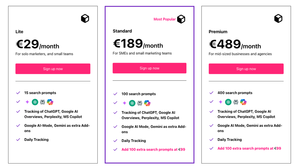 One thing worth flagging: Google AI Mode and Gemini tracking are not included by default on any plan and must be purchased as add-ons, starting at €9/mo on Lite and jumping to €59/mo on Standard.