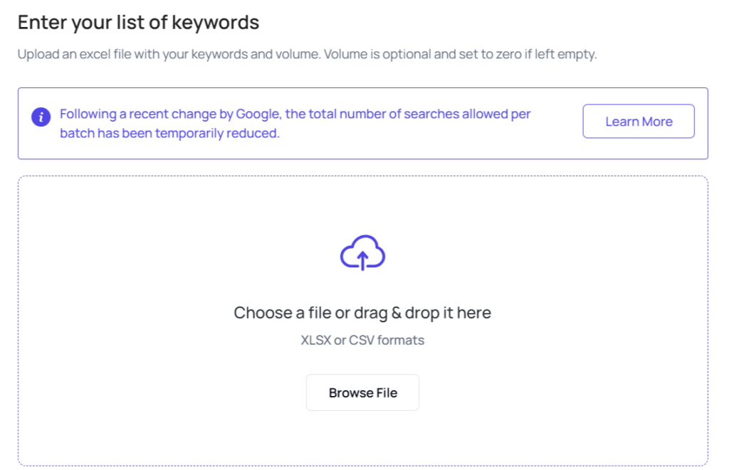 Upload your keyword list, add your domain, and enter your brand name. You can import keywords manually or from a file.