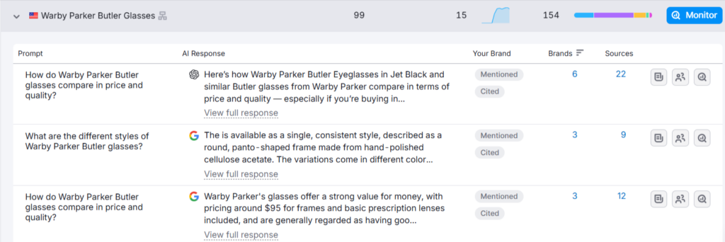 For each prompt (keyword), Otterly shows whether your brand appeared, where it appeared among cited sources, and the sentiment of the mention.