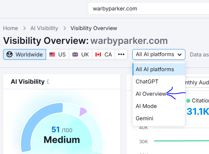 You can narrow the report to only AI Overviews by clicking the “All AI platforms” drop-down.