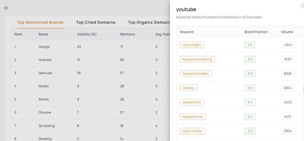 You can also click on any competitor domain to see keywords where they are mentioned in AI Overviews.