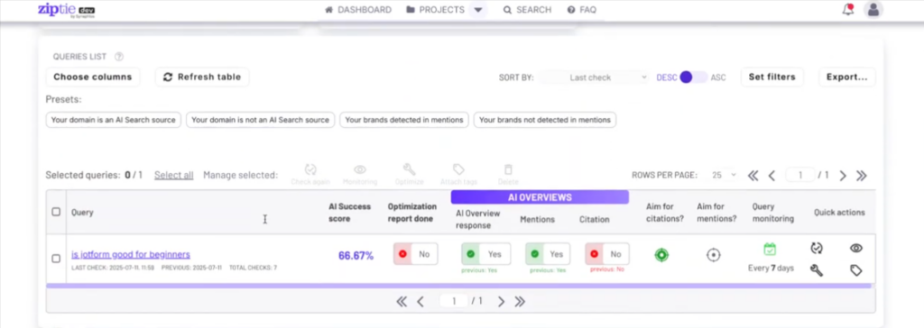 - Teams that need traditional SEO data in the same platform: Ziptie focuses entirely on the AI visibility layer; there is no keyword research, backlink analysis, or site auditing