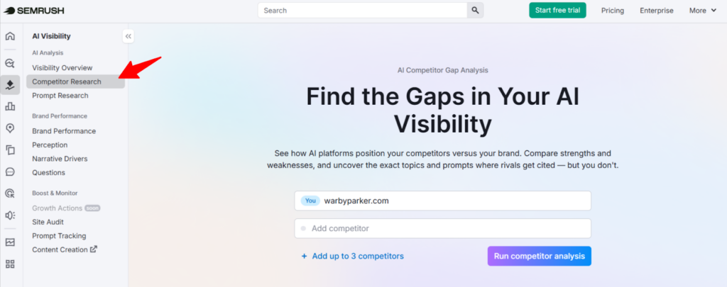 You can also use the “Competitor research option” to track how often competitors are mentioned alongside you in AI answers. This section shows which competitors are winning AI visibility you do not yet have, and for which topics.