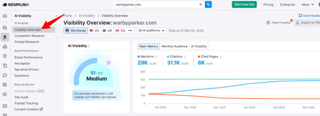 The Visibility Overview report shows monthly trends in how often your brand is mentioned in AI-generated answers and how many pages from your site are cited.
