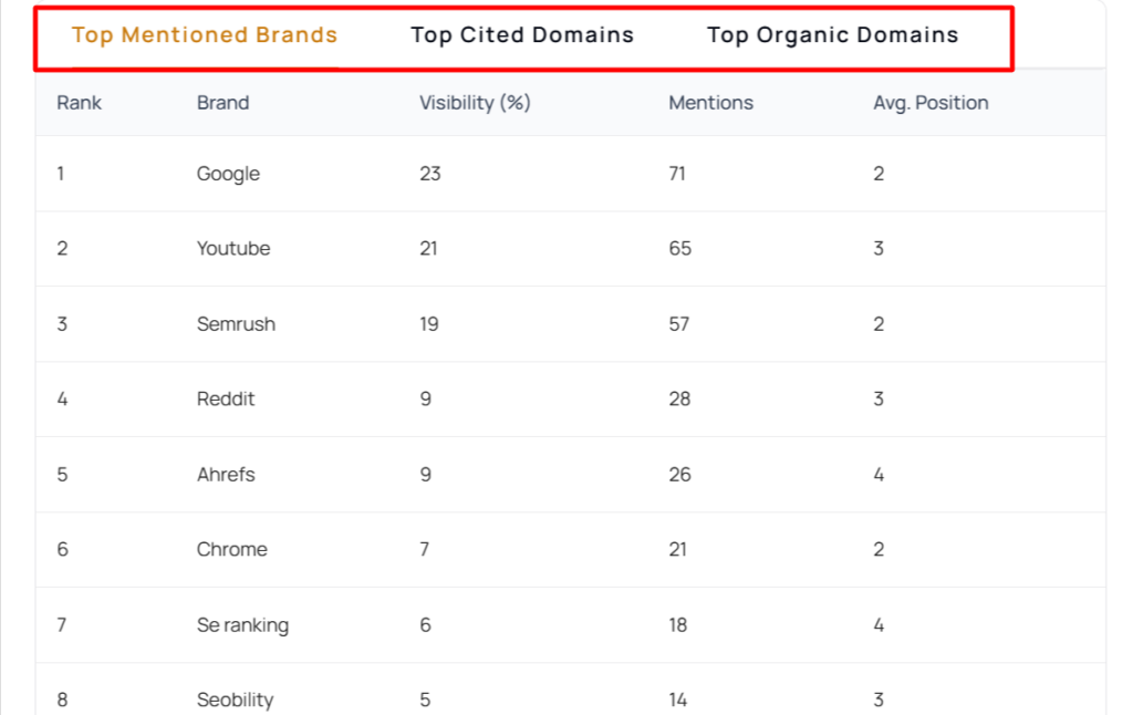 In the overview section, you can see the top-mentioned brands, top-cited domains, and top organic-ranking domains, along with their visibility metrics.