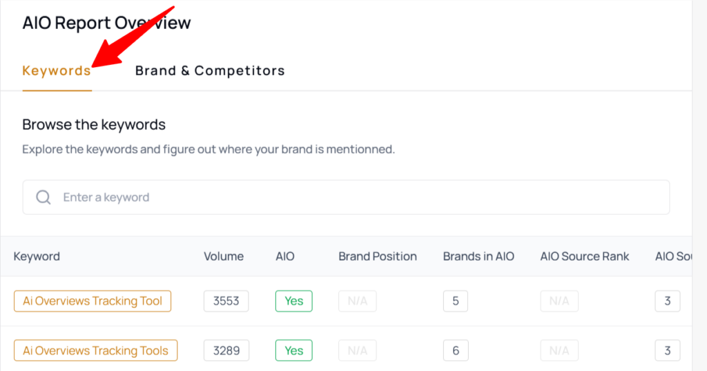 Next, scroll down and click “Keywords” beneath the “AIO Report Overview” to know your keywords that trigger AI Overviews and how your brand shows up.