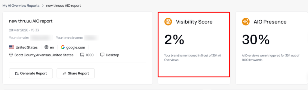 In addition to the visibility score, the AIO Presence Rate shows the percentage of your tracked keywords that actually trigger an AI Overview.