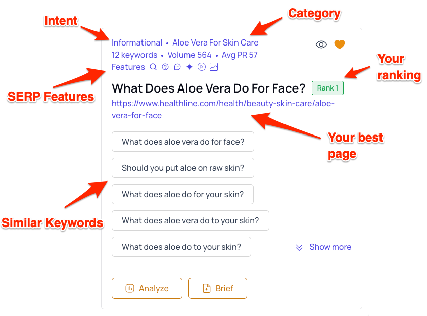 You can now scan key metrics such as volume, intent, SERP features, ranking, and best URL at a glance.