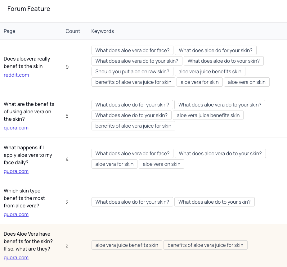 This helps you quickly identify when a cluster contains forum content in the organic results, complementing the Forums and Discussions SERP feature analysis.