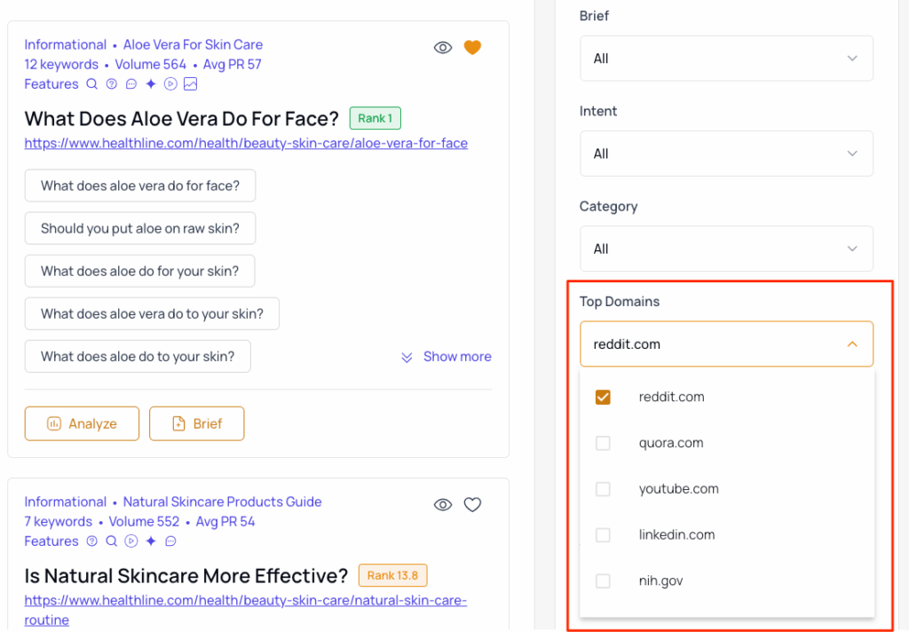 A new Top Domains filter highlights the most frequently appearing sites across clusters, including major platforms like Reddit and Quora.