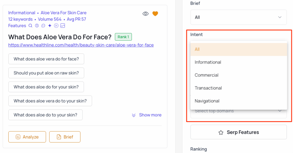 - Search Intent Analysis (Pro & Agency) – understand the dominant intent for every cluster.