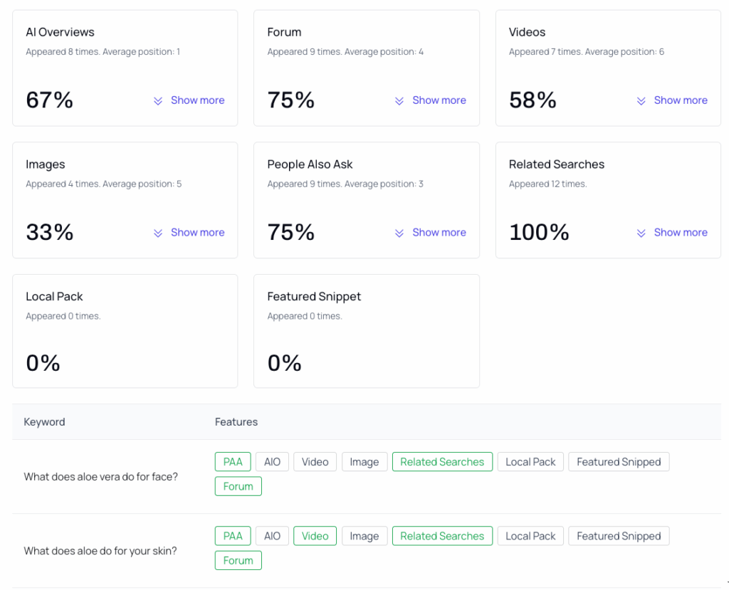- SERP Feature Insights: Aggregated data showing the presence of AI Overviews, forums, People Also Ask boxes, and Local Packs.