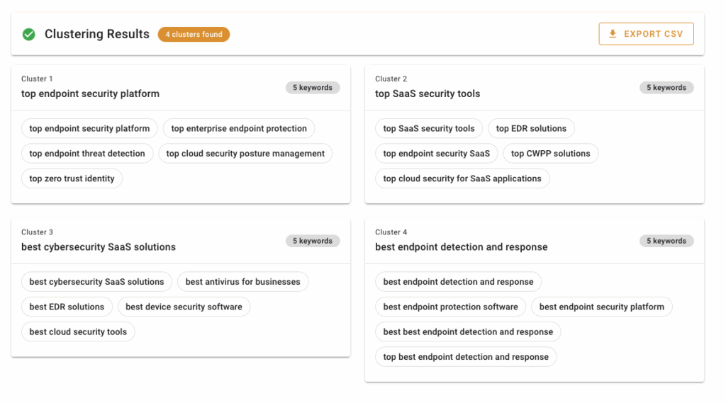 After collecting hundreds or thousands of keywords, it can be hard to know what to do next. Semantic keyword clustering helps organize the list into clear groups and helps identify topics to focus on first.