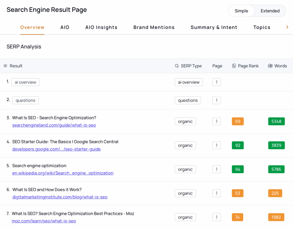 SERP analysis shows what is working on the SERP and idea gaps to outrank your competitors.