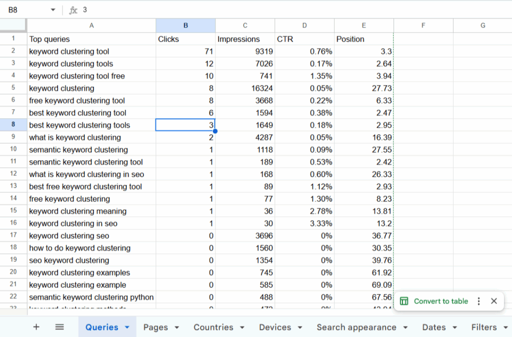 Finally, measure how your clusters perform. Use Google Search Console to monitor impressions, clicks, and keyword variations your pages rank for.