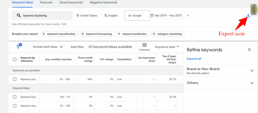 To use Google Keyword Planner, go to: “Google Ads” > “Solutions” > “Keyword Planner” > “Discover new keywords” and enter your keyword. Then, click the export icon at the top right corner to get the list.