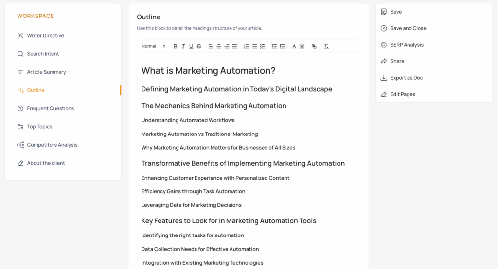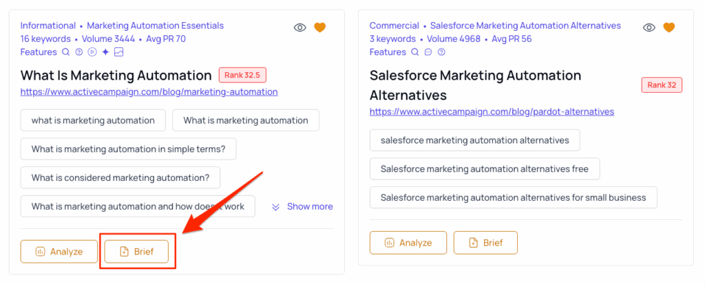 The brief provides everything you need to write better content. It includes title suggestions, structure, questions to answer (PAA), keywords, competitor analysis, an AI outline assistant, and more.