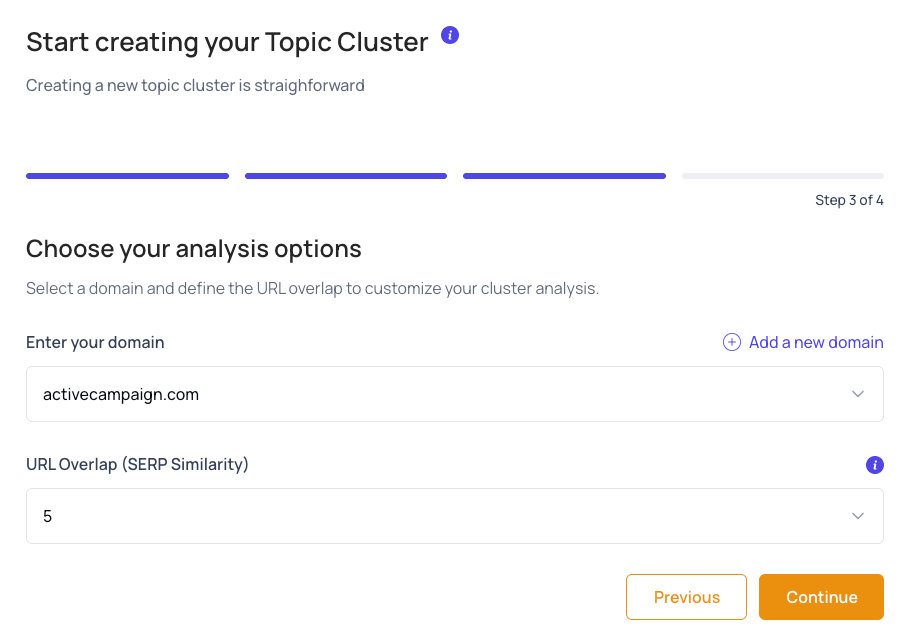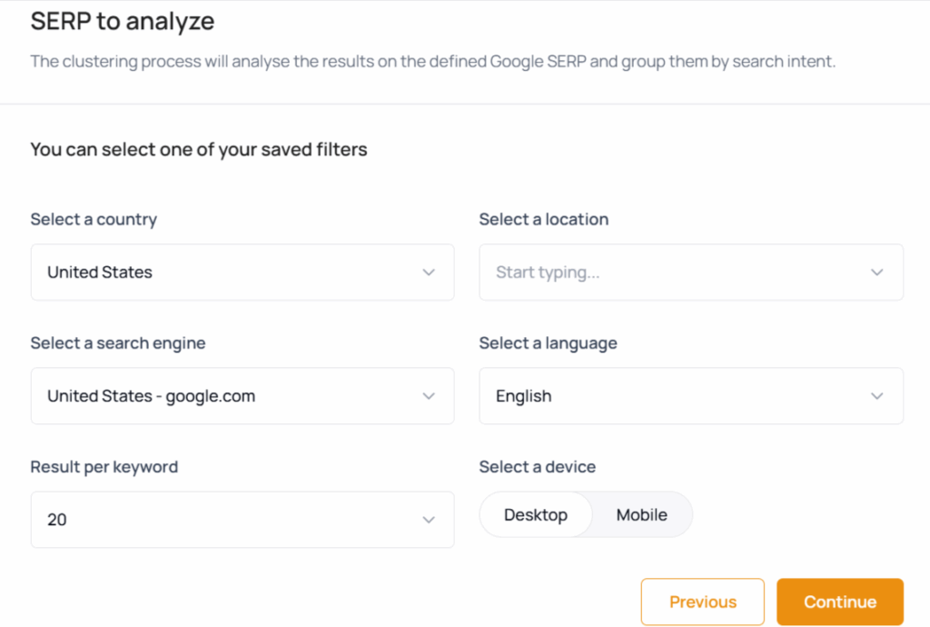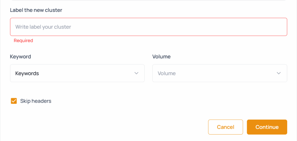 Next, create a name for your new clusters, choose the headers available on your keyword list, and click “Continue.”
