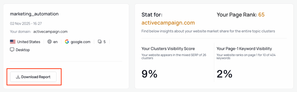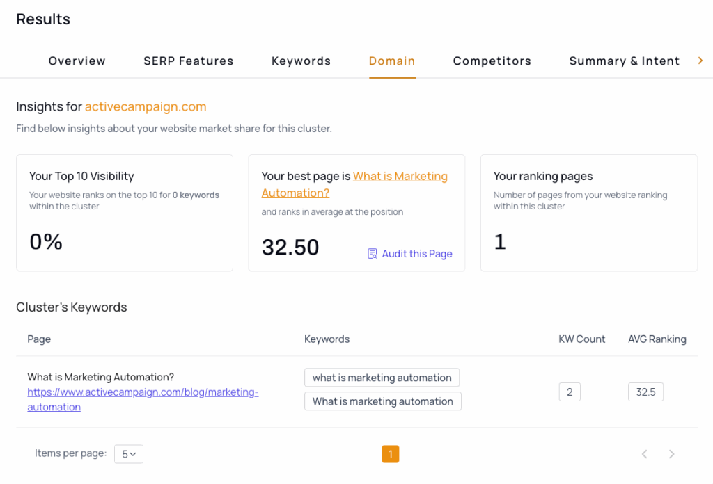As you notice, we enter the domain “activecampaign.com”, which is a marketing automation tool. We will review their content strategy and create a keyword mapping for them.