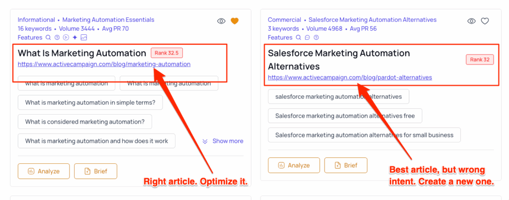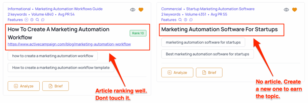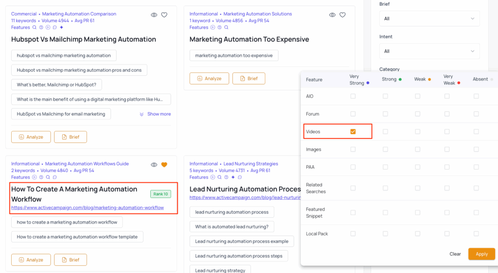 For instance, instead of just optimizing your article on Marketing Automation Workflows (which already ranks in the top 10), it might be smarter to create a complementary YouTube video.