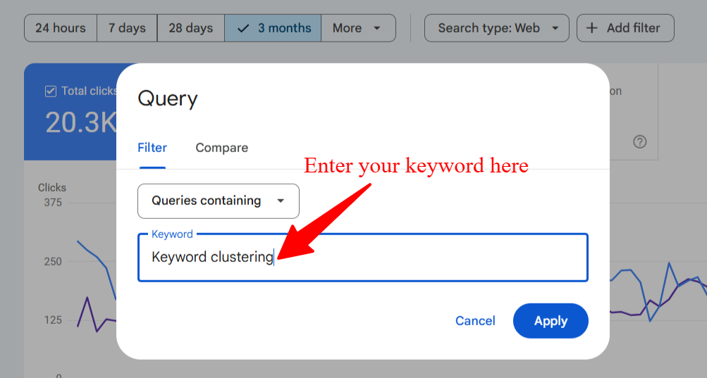 To get your keyword list from Google Search Console, go to “Search Results” > “Add filter” > “Query” > “Queries containing” and enter a seed keyword.