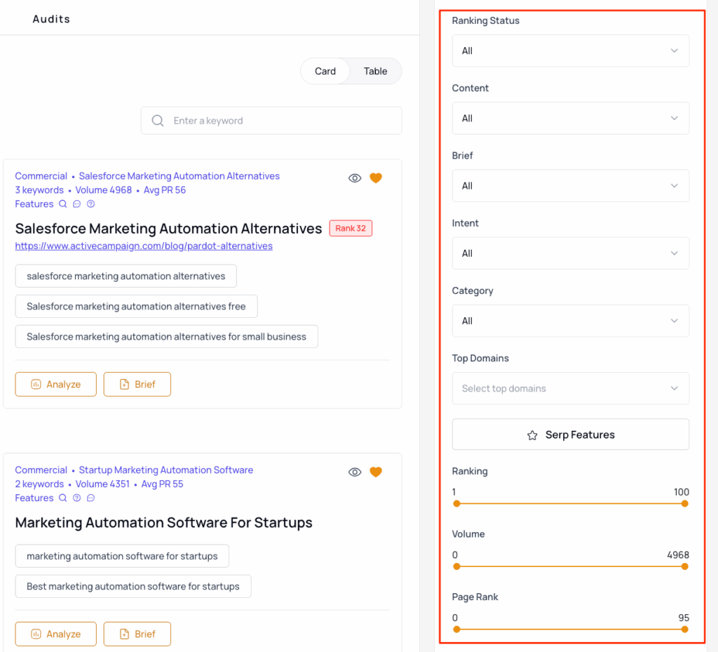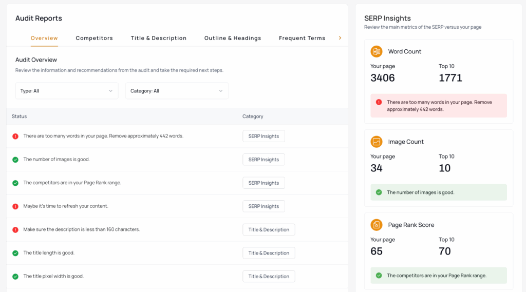 You can also perform an instant page audit to review the content and see how it compares to competitors’ pages.