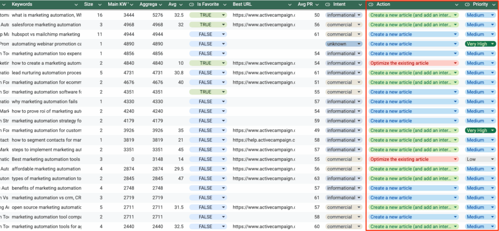 Go back to your Excel file, identify clusters that need new content or optimization, and take the following actions.