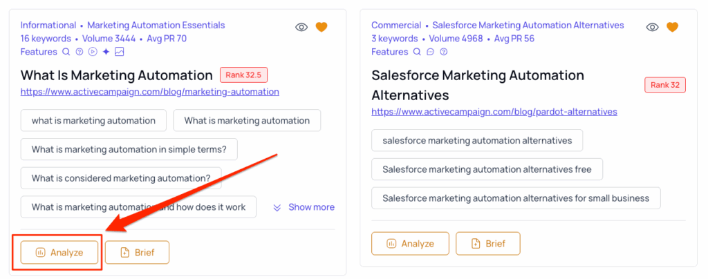 Use the “Analyze” icon on the thruuu topic cluster dashboard to support this process and make informed decisions about how to optimize or create your content.