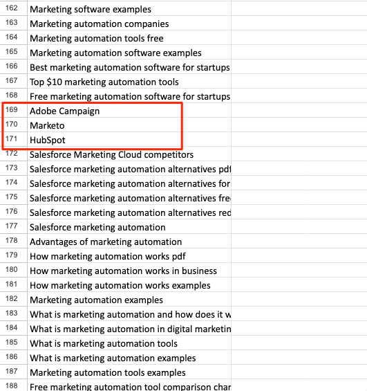 For instance, in our files, we removed navigational queries leading to Marketing automation tools. We don’t need to include this in our keyword mapping.