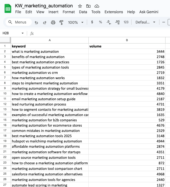 Note: For the rest of the article, we will continue with our list of keywords and build an SEO keyword map around the main topic of marketing automation. At the end of the article, you can download all the files shared in this article.