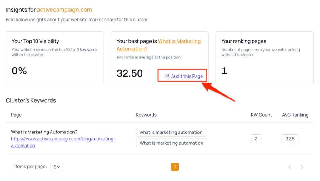 As you can see our best page “What is marketing automation” only ranks for 2 keywords within this cluster.