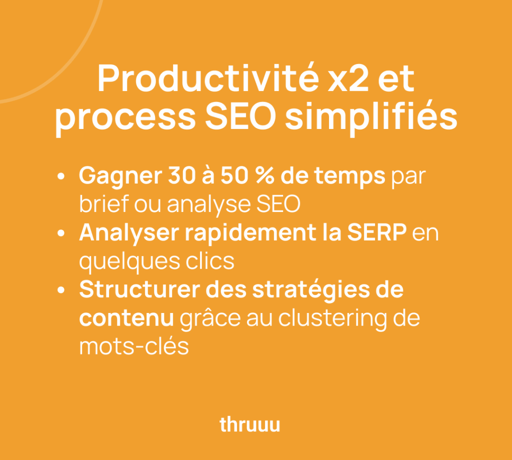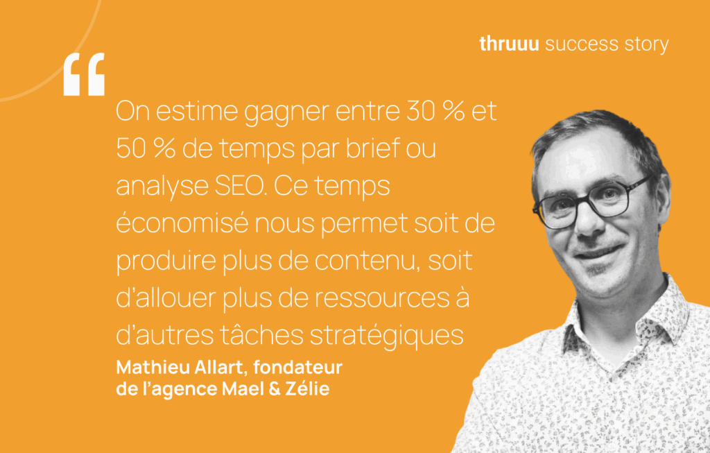 « thruuu a permis de gagner en clarté, en cohérence et en productivité. Les briefs sont mieux structurés, plus faciles à comprendre pour les rédacteurs, et parfaitement alignés avec les attentes SEO. Leur côté personnalisable facilite aussi l’adaptation selon les projets ou les clients”.
