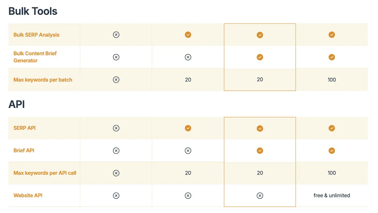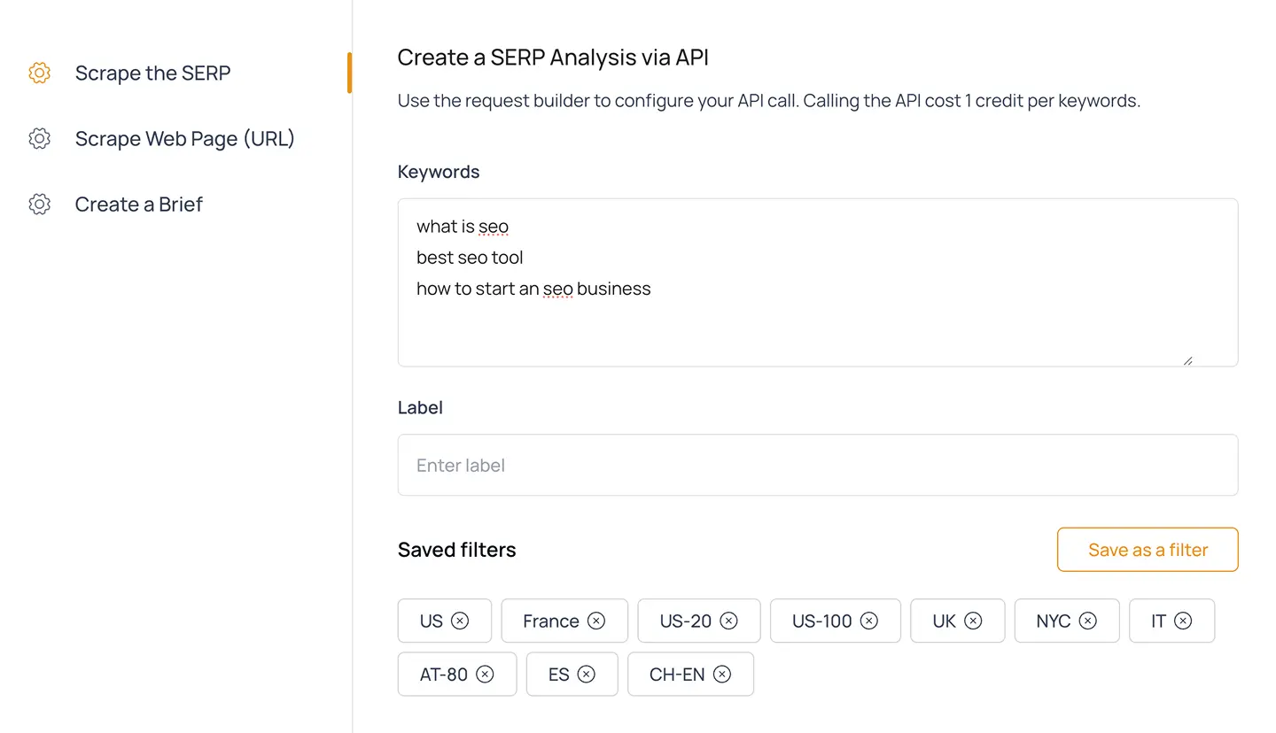 SERP analysis costs 1 credit per keyword. Briefs cost 5 credits each (includes SERP analysis). Web API is free for Agency plans. Scale up or down based on your needs.
