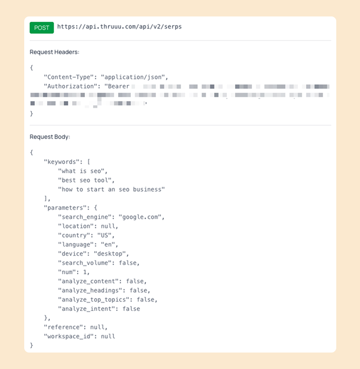 The thruuu API gives you programmatic access to 100-result SERP analysis, AI Overview data, and content briefs. Built for teams that need search data at scale.